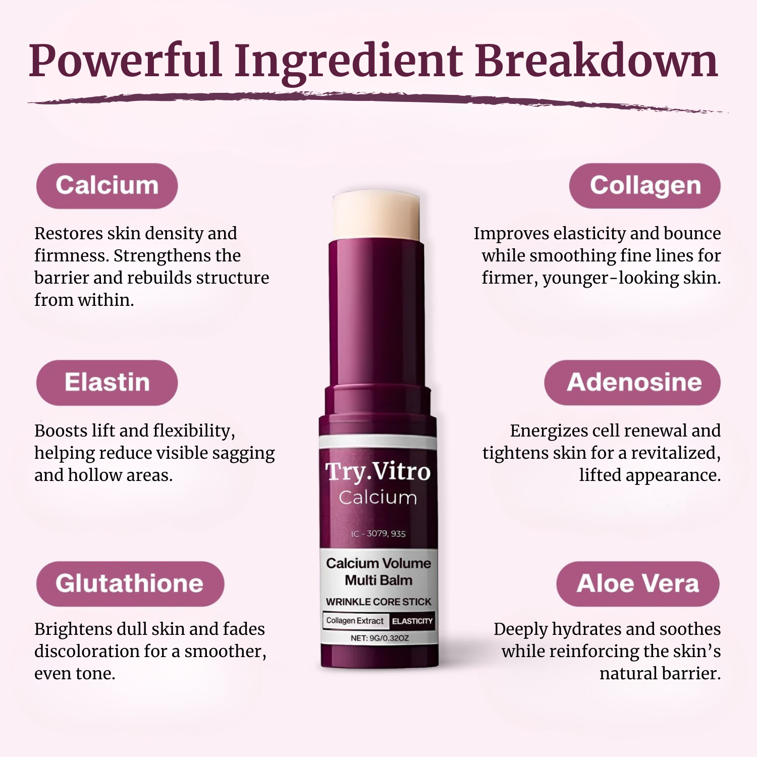 Aging skin loses Calcium, Collagen, and Elastin, causing wrinkles and sagging. Vitro’s balm restores these essentials, strengthens the barrier, improves elasticity, and deeply hydrates — leaving skin firmer, smoother, and visibly youthful.